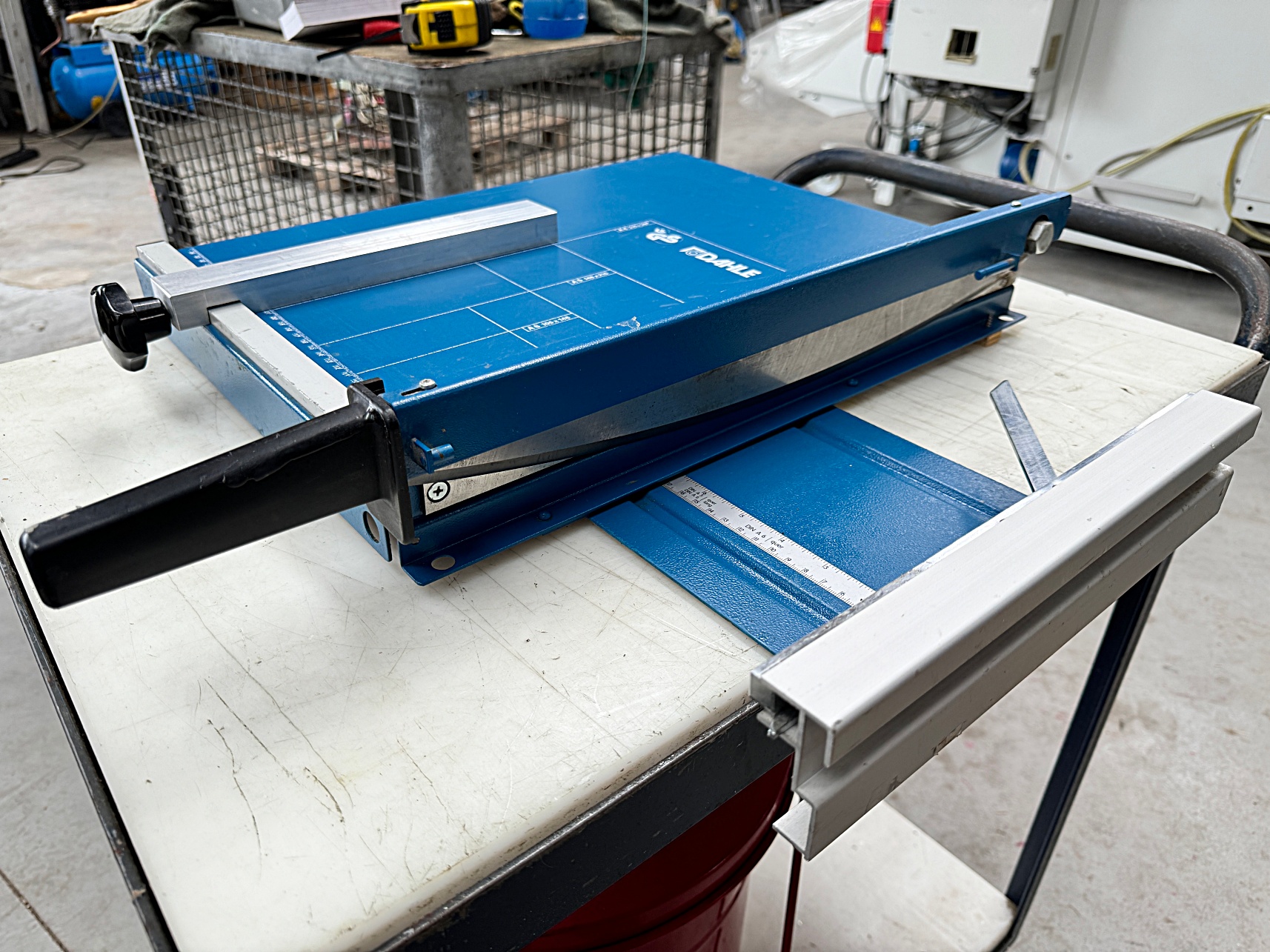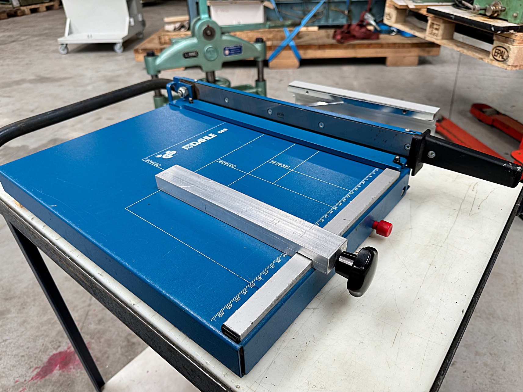 | Description | Manual table model paper cutter with adjustable and retractable side table (170 mms), register board with adjustable ruler, automatic clamp and pressing and manual crank cutting. |