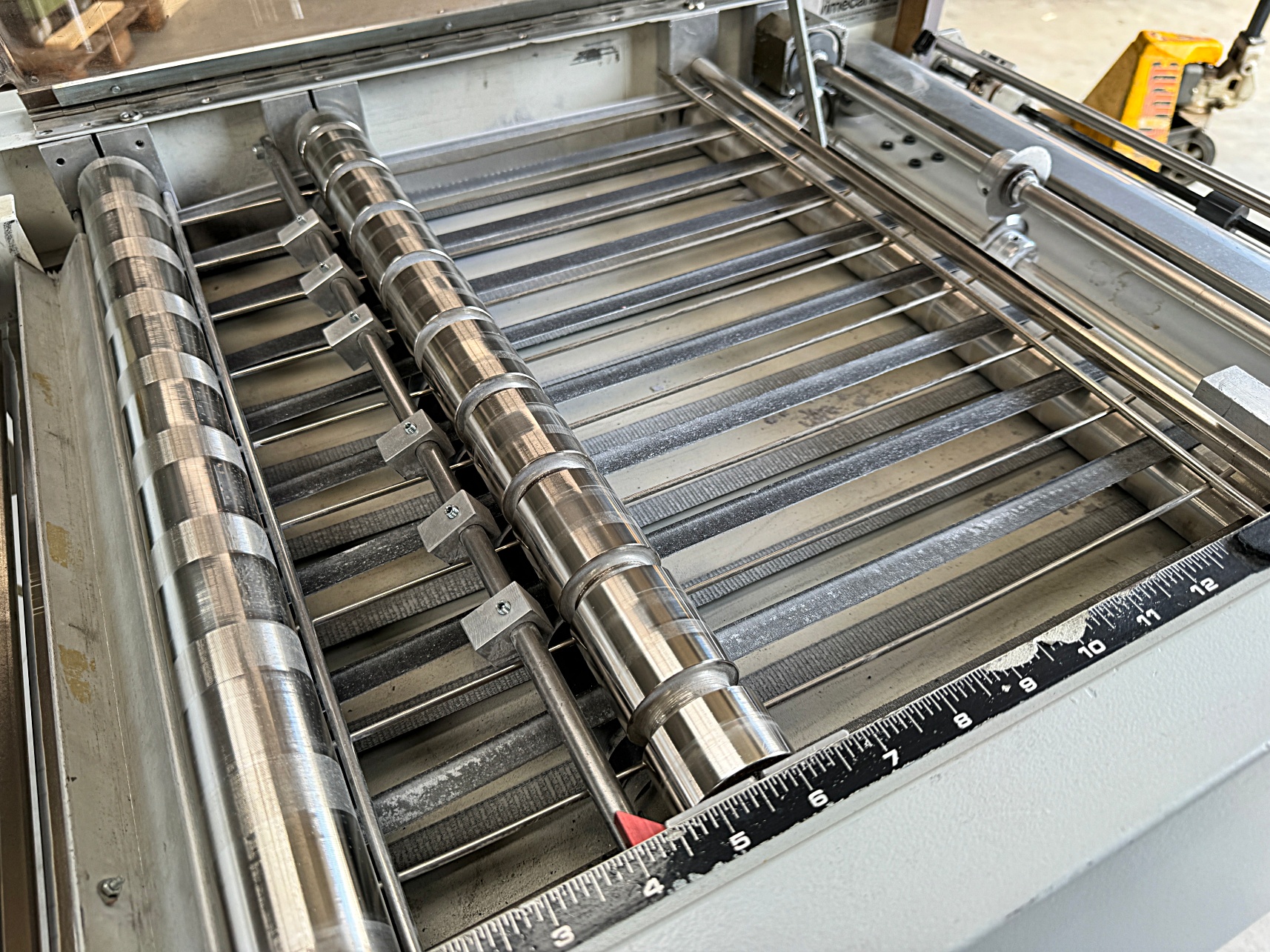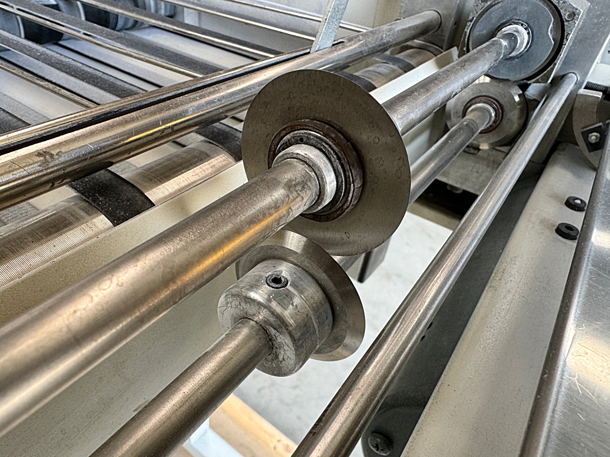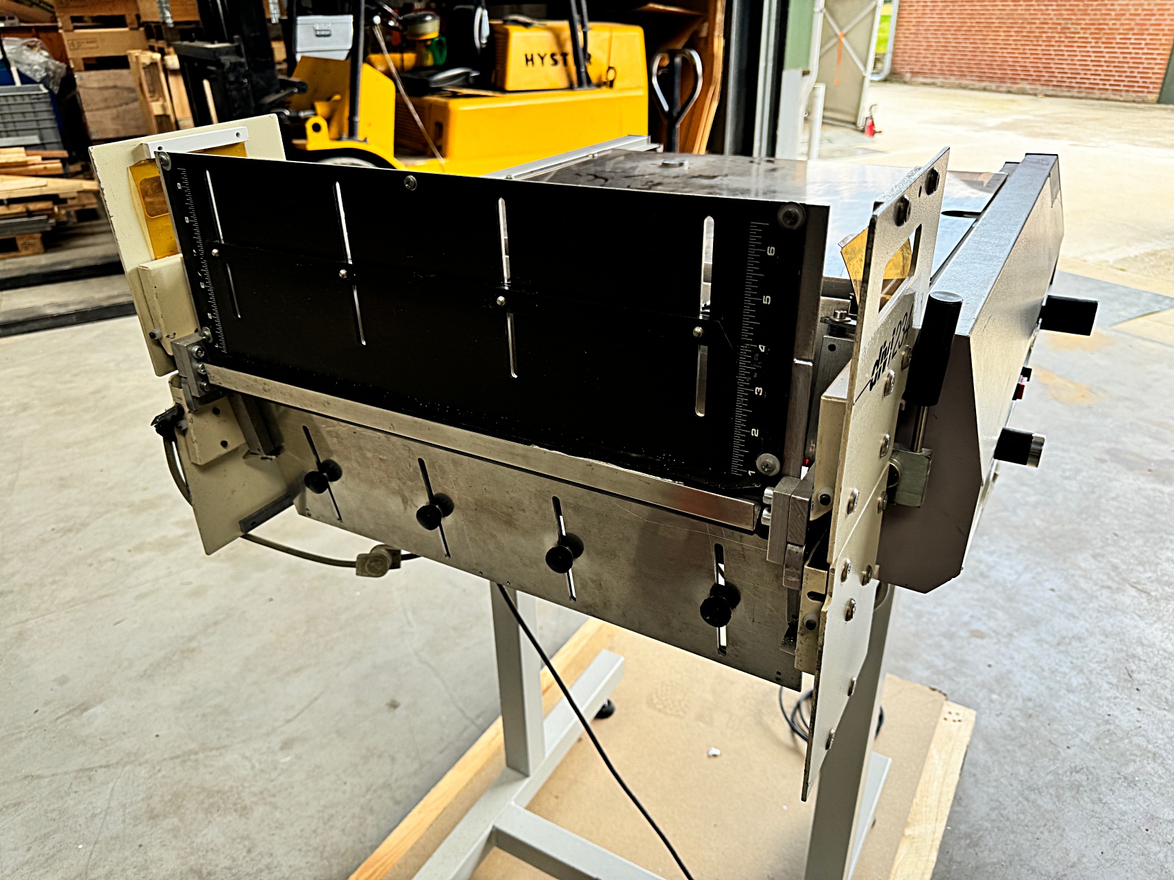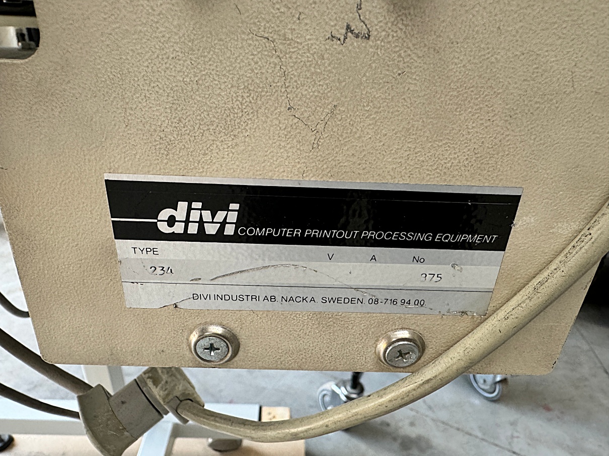 | Description | Computer forms printout processing equipment for pin-feeding the web into the machine, cutting the web length wise with a cutting wheel and fold it zig-zag into a box for further handling. Programs for length of the forms to make on the operating console. |