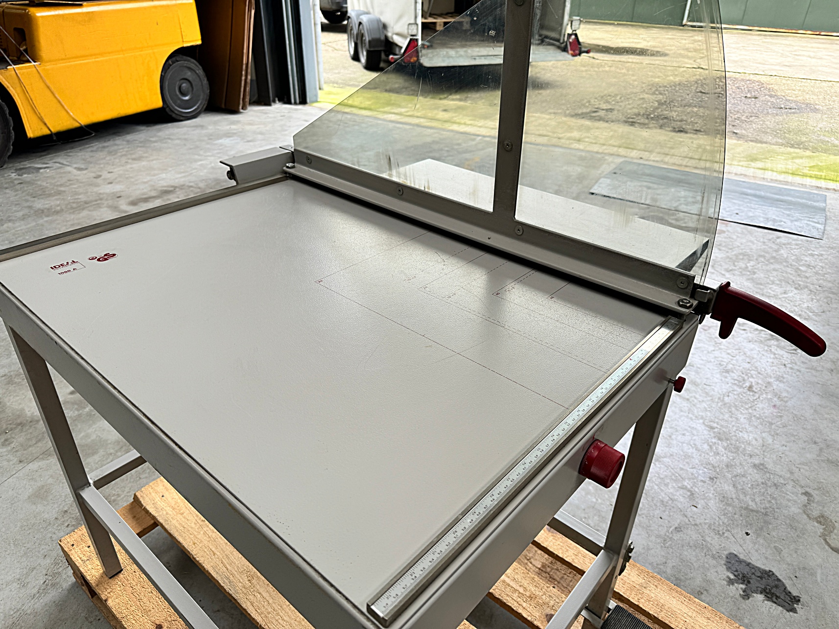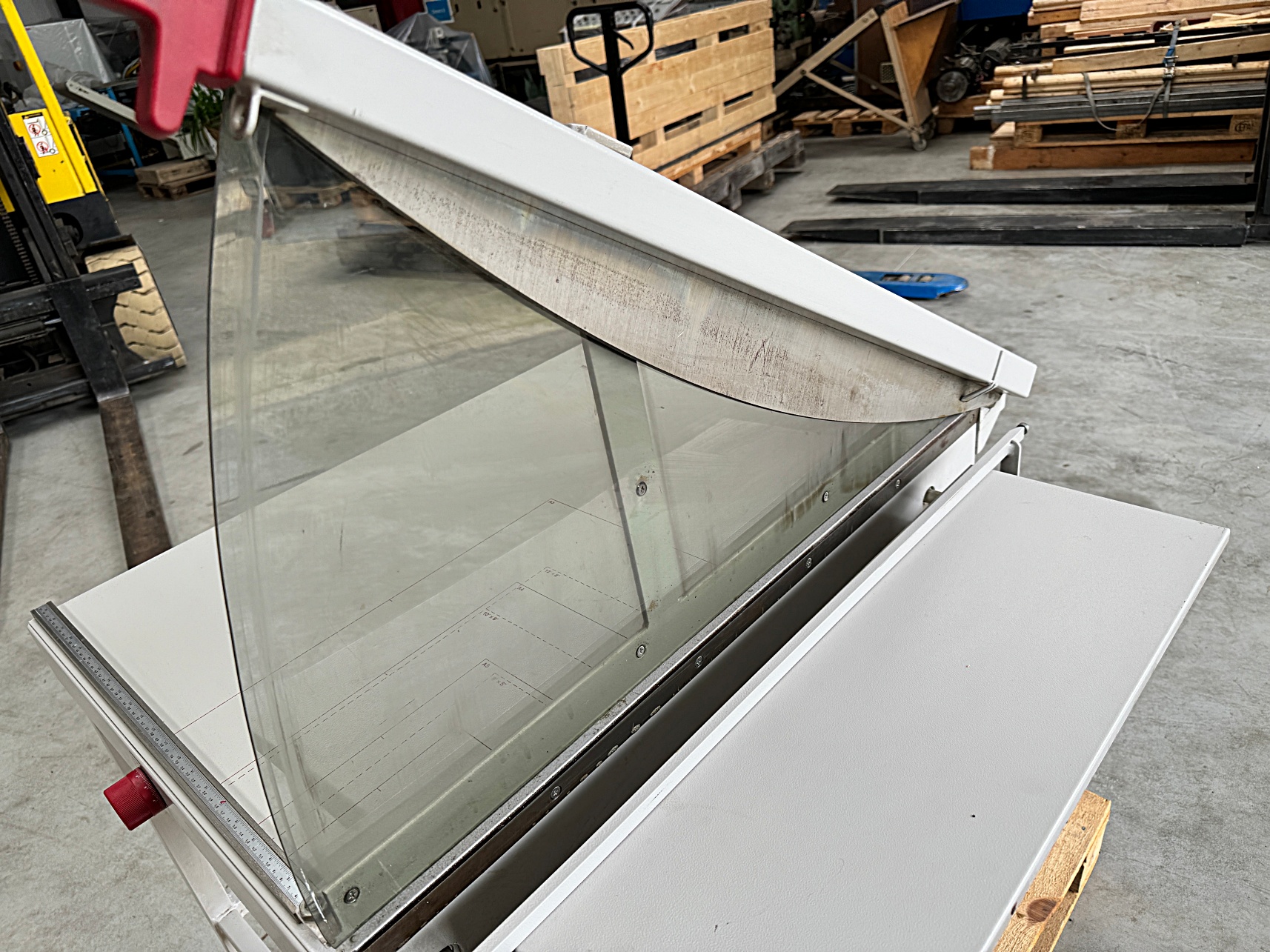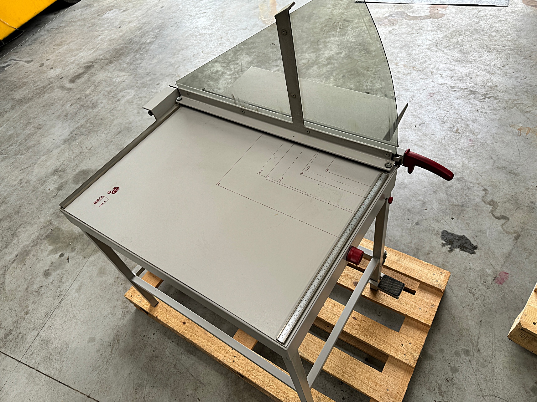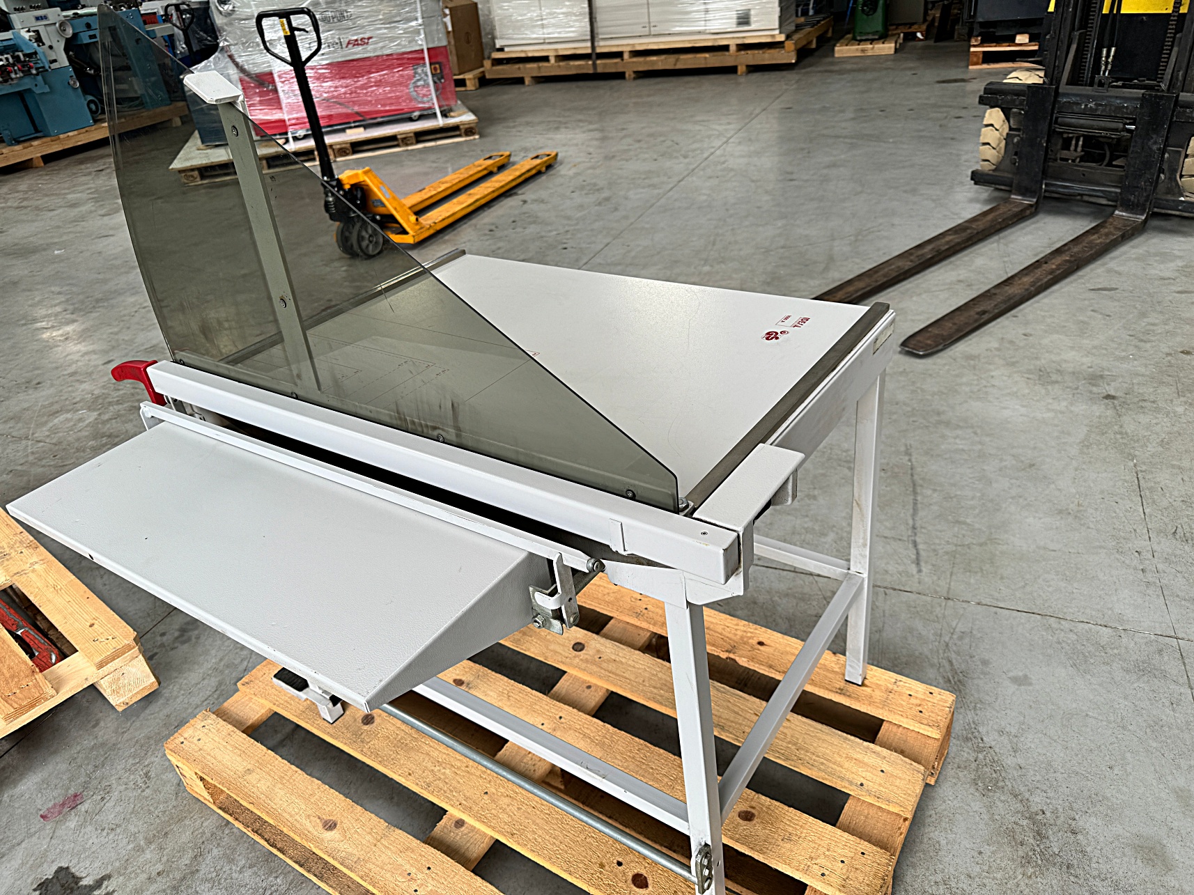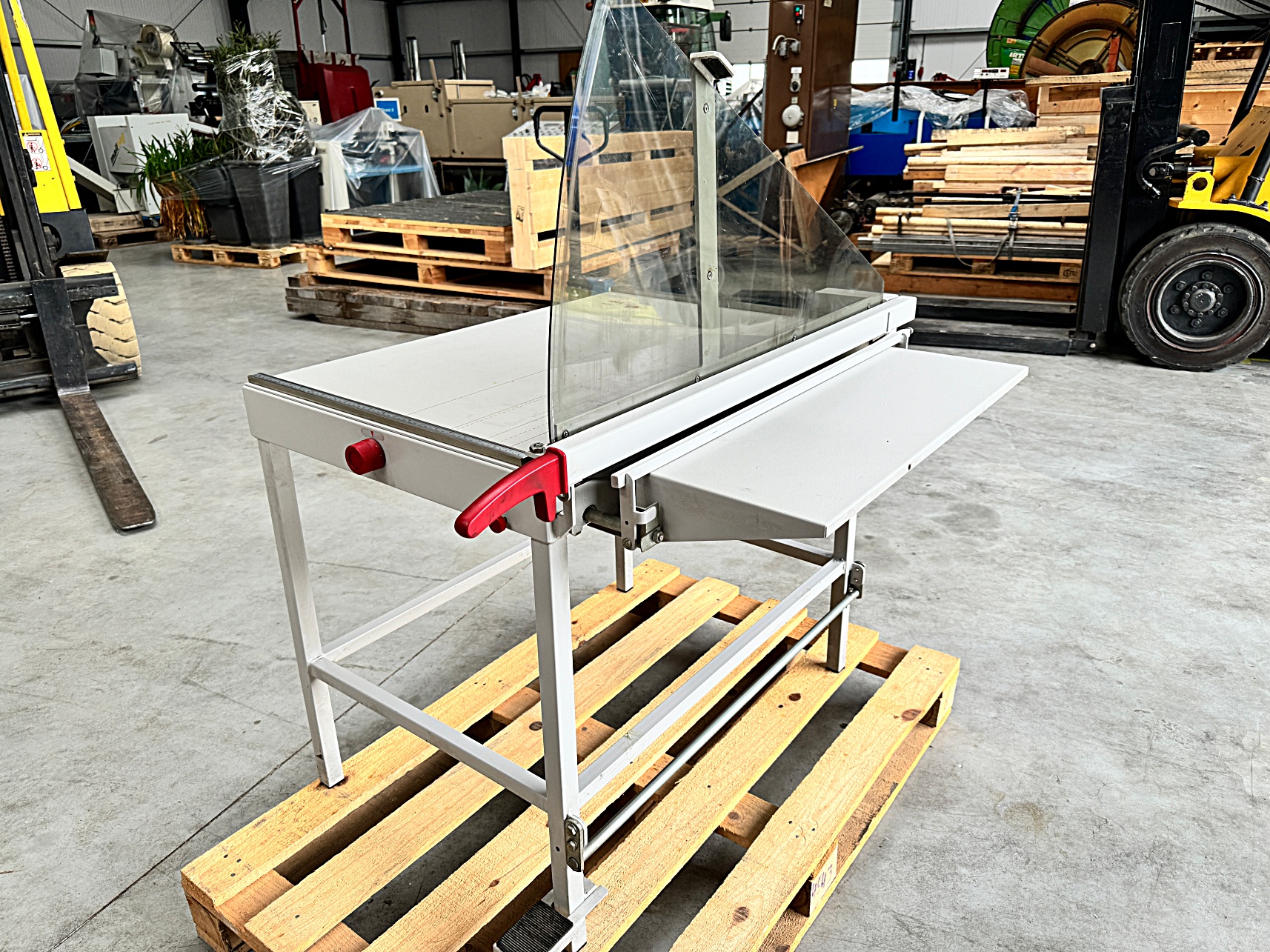 | Description | Manual paper- and cardboard cutter with adjustable and retractable side table, footpedal clamp and pressing, safety shield and manual crank cutting. |