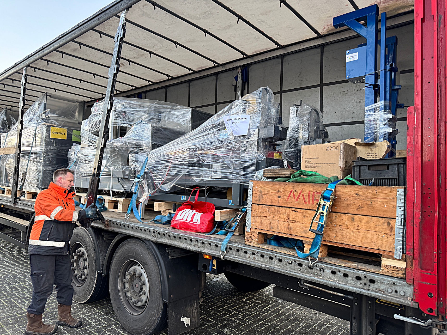 We take care of: the technical inspection, the technicians, the tools, the rigging on the machinepallets with the packing, the forklifts and the internal transportation to the loading area, the insurance during the transport on our own trucks, vans and trailers, and of course the installation and bringing it all back to the best production situation. All in one hand: safe, sound and clear for all involved parties.
