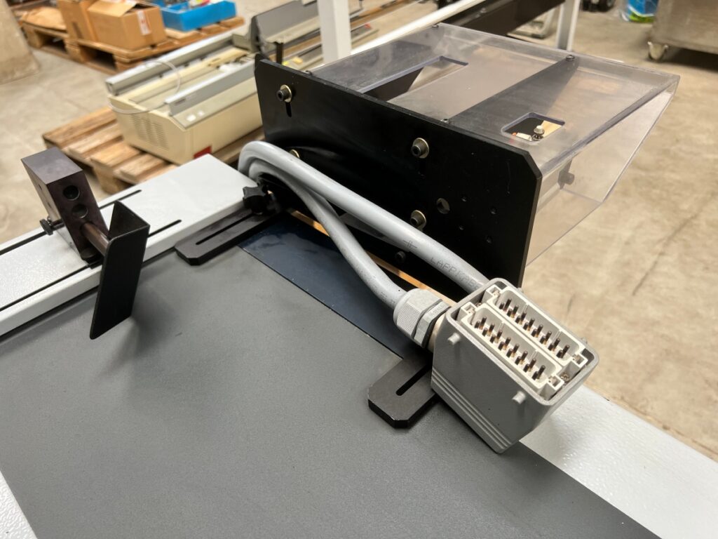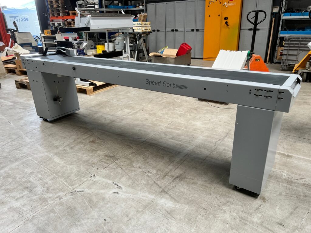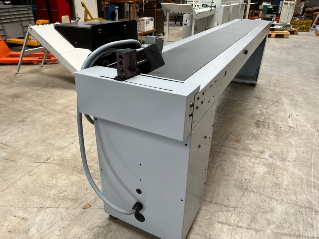 DescriptionRetractable conveyor belt for online use with all kind of (mailing) equipment. Machine has air supply for easy layout of paper, envelopes or other mail results.