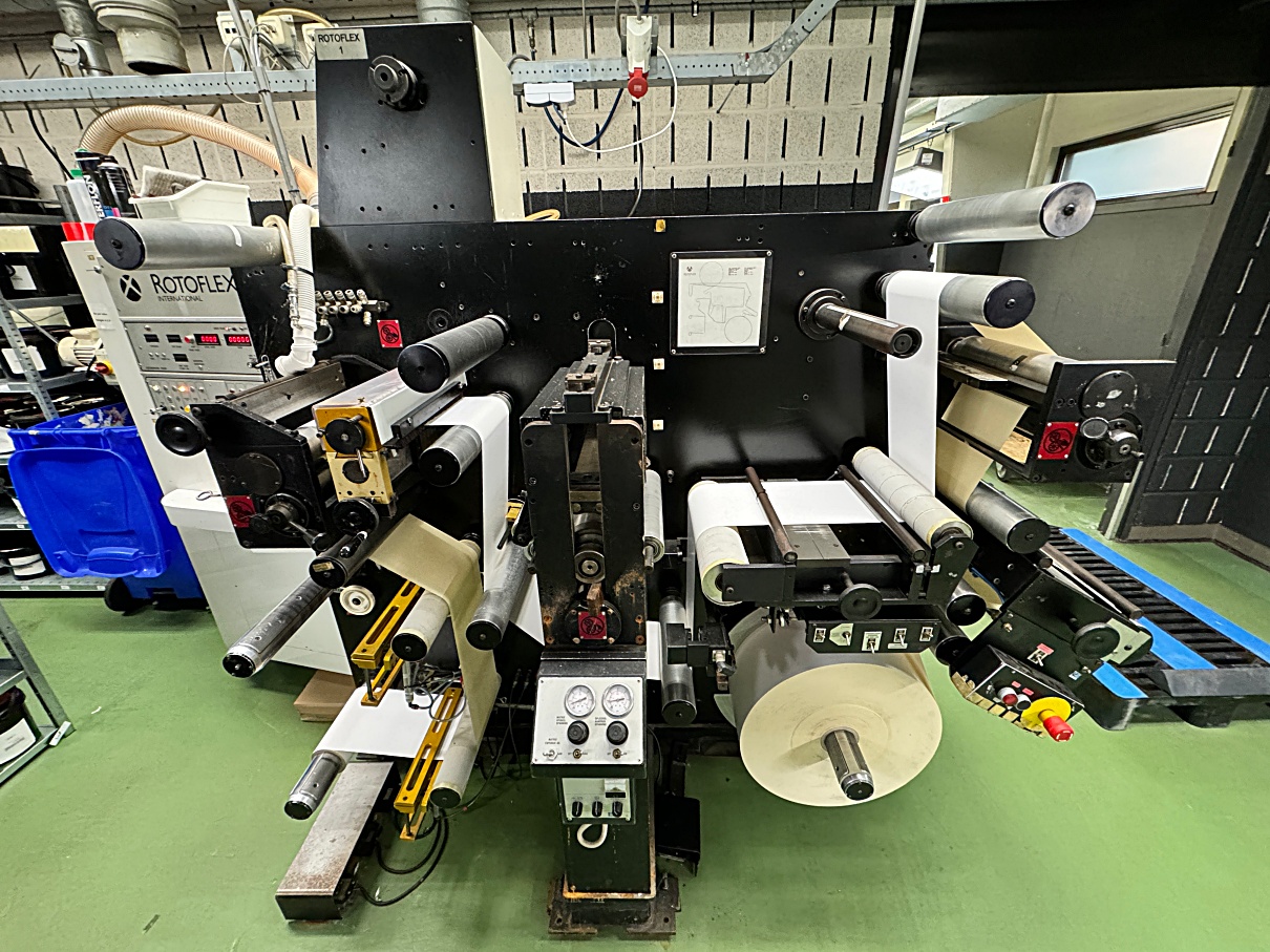 DescriptionSlitter / die-cutter / cutter / rewinder with visual inspection and label checking. Unwind with tension control and single edge guiding. Pneumatic bars on the splice tables for changing rolls. Central operation for all functions and jobs. For automatic rewinding (2 driven spindles) and cutting rolls in register to smaller size rolls with up to 12 roll knives and separators. Single die-cutting station (no tooling coming) with a matrix waste rewinder. During the process the labels can be counted (numbers and meters) and checked for quality and missing labels with a missing label system.