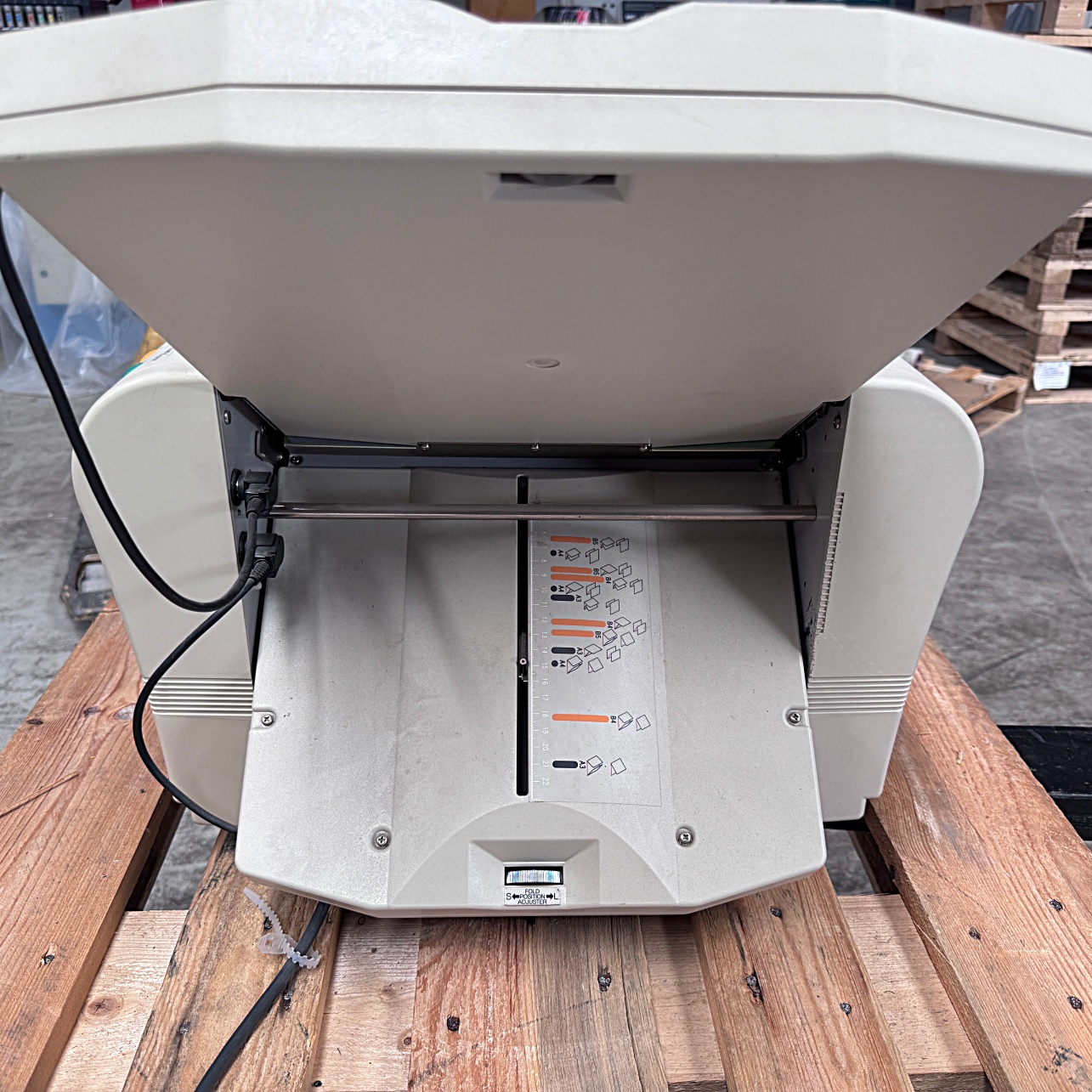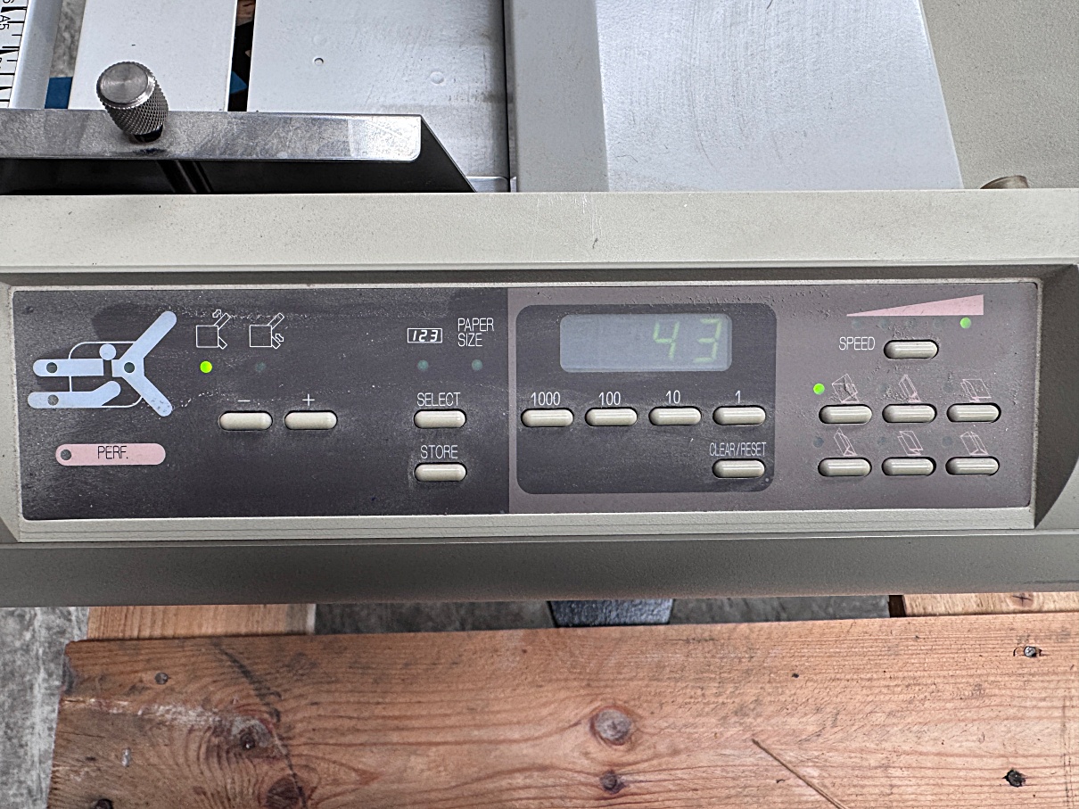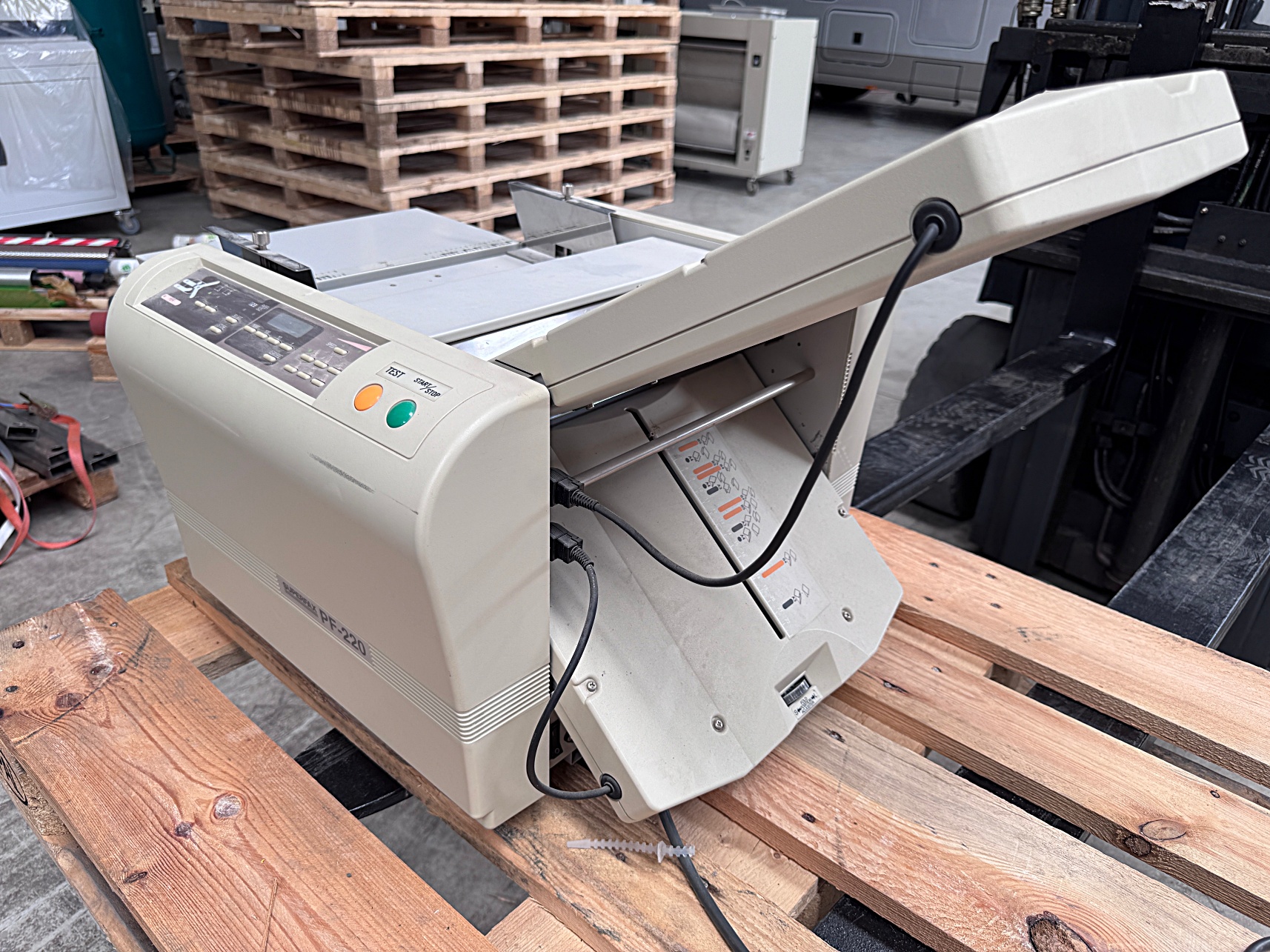 | Description | Table model fully automatic (format and paper size) friction feed folder with flat pile feeder with centering table, 2 strokes straight folding (fully automatic set up), easy set-up on operation panel with digital programming, settings, job-memory, (batch-) counter and a standard delivery. All safeties and noise hoods. |